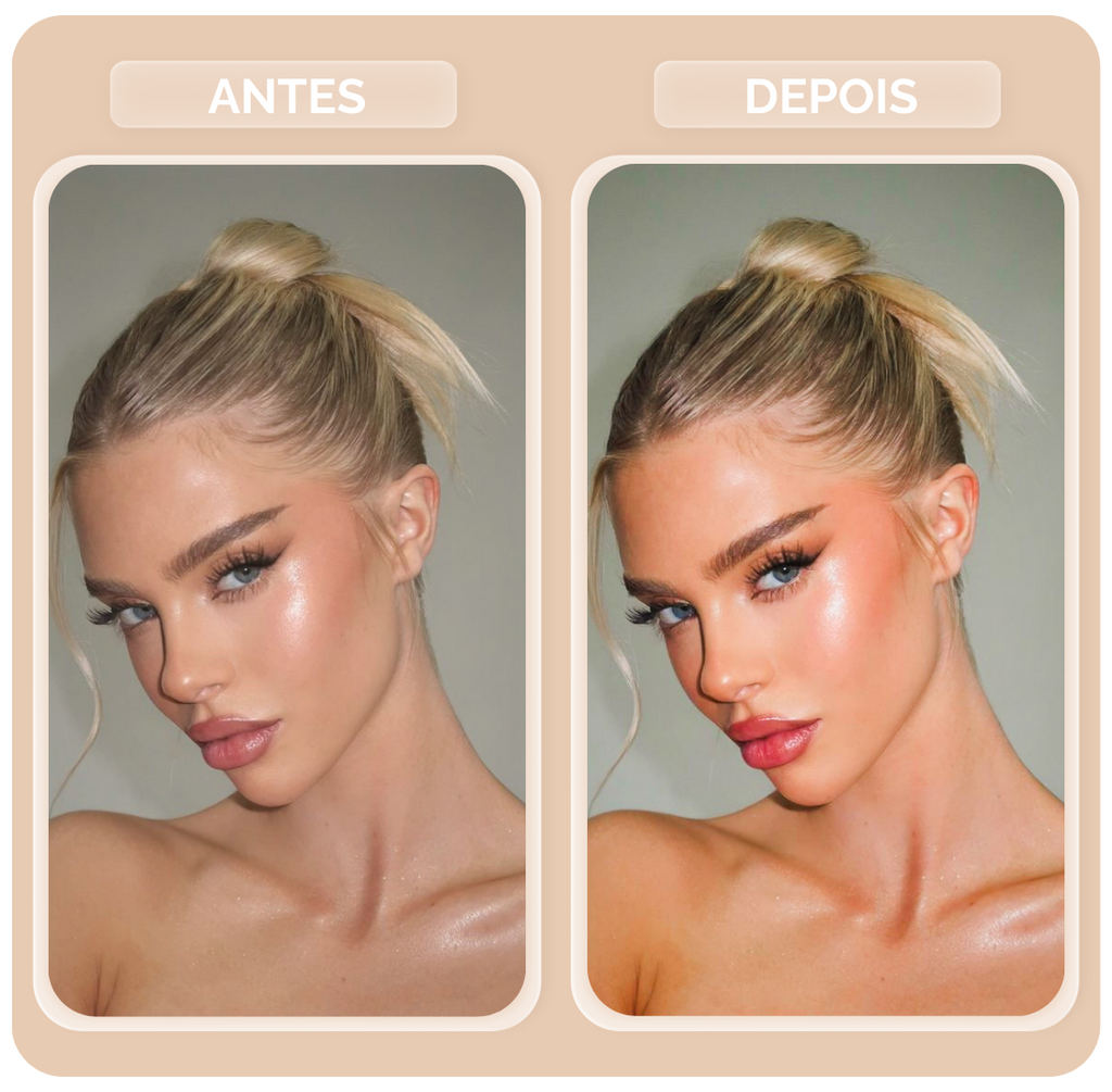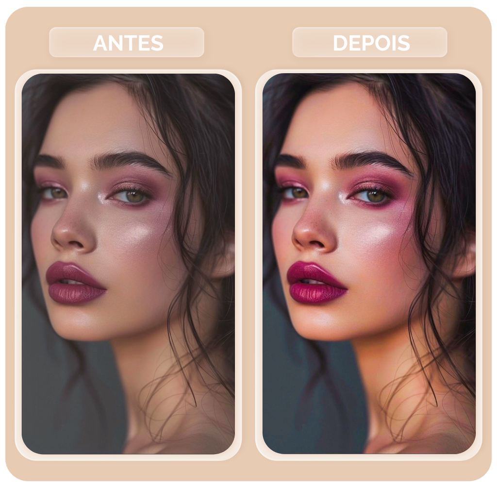 O pack PERFECT MAKEUP foi desenvolvido para ser o melhor amigo de quem ama beleza. Ele foca na suavização inteligente da pele (preservando a textura natural), no realce das cores das sombras e batons, e no brilho estratégico do iluminador. É o preset indispensável para elevar o nível das suas selfies e fotos de beleza, garantindo um acabamento de estúdio profissional em segundos.