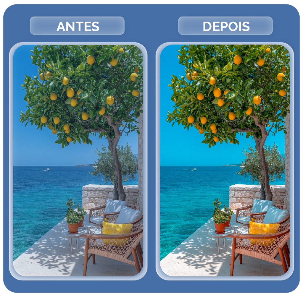 • 13 Presets Profissionais (Focados em brancos puros e azuis mediterrâneos).