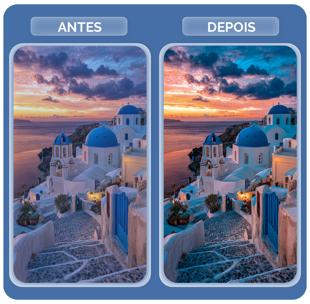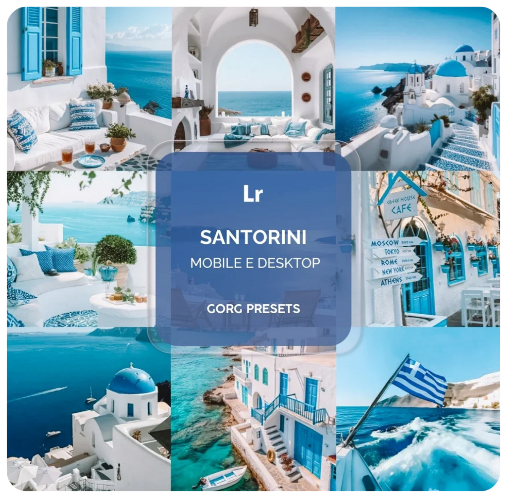 O pack SANTORINI é a tradução da luz do Mediterrâneo. Ele foi desenvolvido para destacar o contraste icônico entre o branco radiante e o azul profundo. O preset limpa os tons amarelados das construções, deixando o branco impecável, enquanto intensifica o azul do céu e do mar com precisão. É a ferramenta definitiva para quem deseja fotos extremamente luminosas, nítidas e com a sofisticação das ilhas gregas.